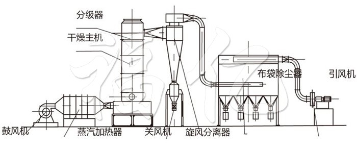 4. Due to the high speed of gas at circle inside the drying chamber and the staying time of raw material is short, high efficiency and quick speed can be realized