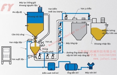 Khi nh?p nguyên li?u vào , v?t li?u ?i qua van chuông , van b??m ?ôi ho?c van b??m ki?u b?m ph?ng d??i tác d?ng c?a tr?ng l?c s? ???c ??a vào thùng truy?n phát , Nh?ng không khí ???c thay th? s? ???c van x? ??a ra ngoài , khi?n cho vi?c nh?p nguyên li?u d? dàng h?n . Khi mà thùng truy?n phát ?ã ??y ( khi dung tích c?a thùng ?ã ??t ??n 80% và ???c hi?n th? thông qua các thi?t b? ?o l??ng và cân n?ng v?t li?u ) , van nguyên li?u và van x? s? l?p t?c t? ??ng ?óng và niêm phong l?i